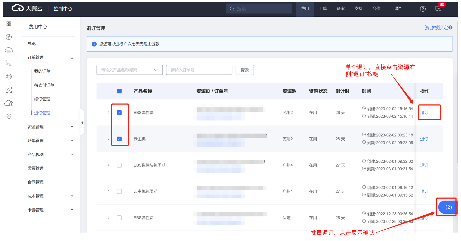 2、選擇要退訂的資源,點擊退訂,進入退訂詳情頁面。天翼云目前支持單個退訂和批量退訂。