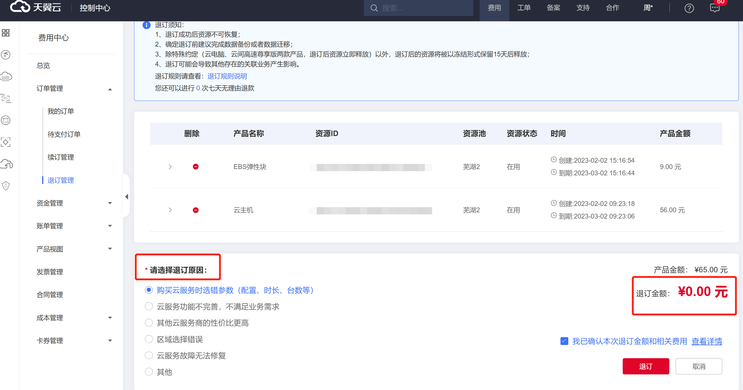 (截圖示例中資源通過代金券購買,且7天無理由退訂次數已用完,退訂不返還代金券,因此退訂金額為0元)