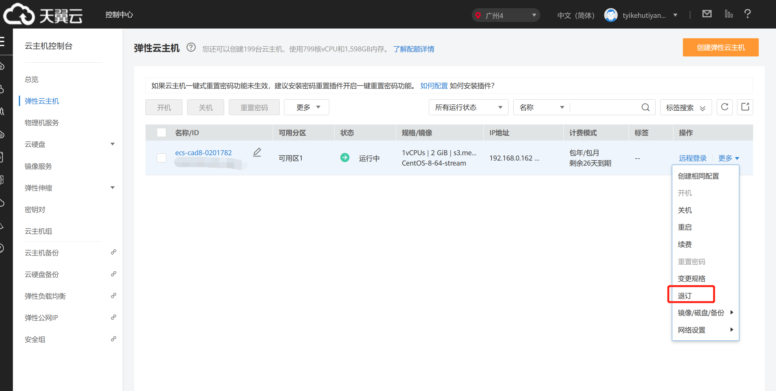 2、選擇需要退訂的資源,點擊右側“更多-退訂“,進入退訂詳情頁面。