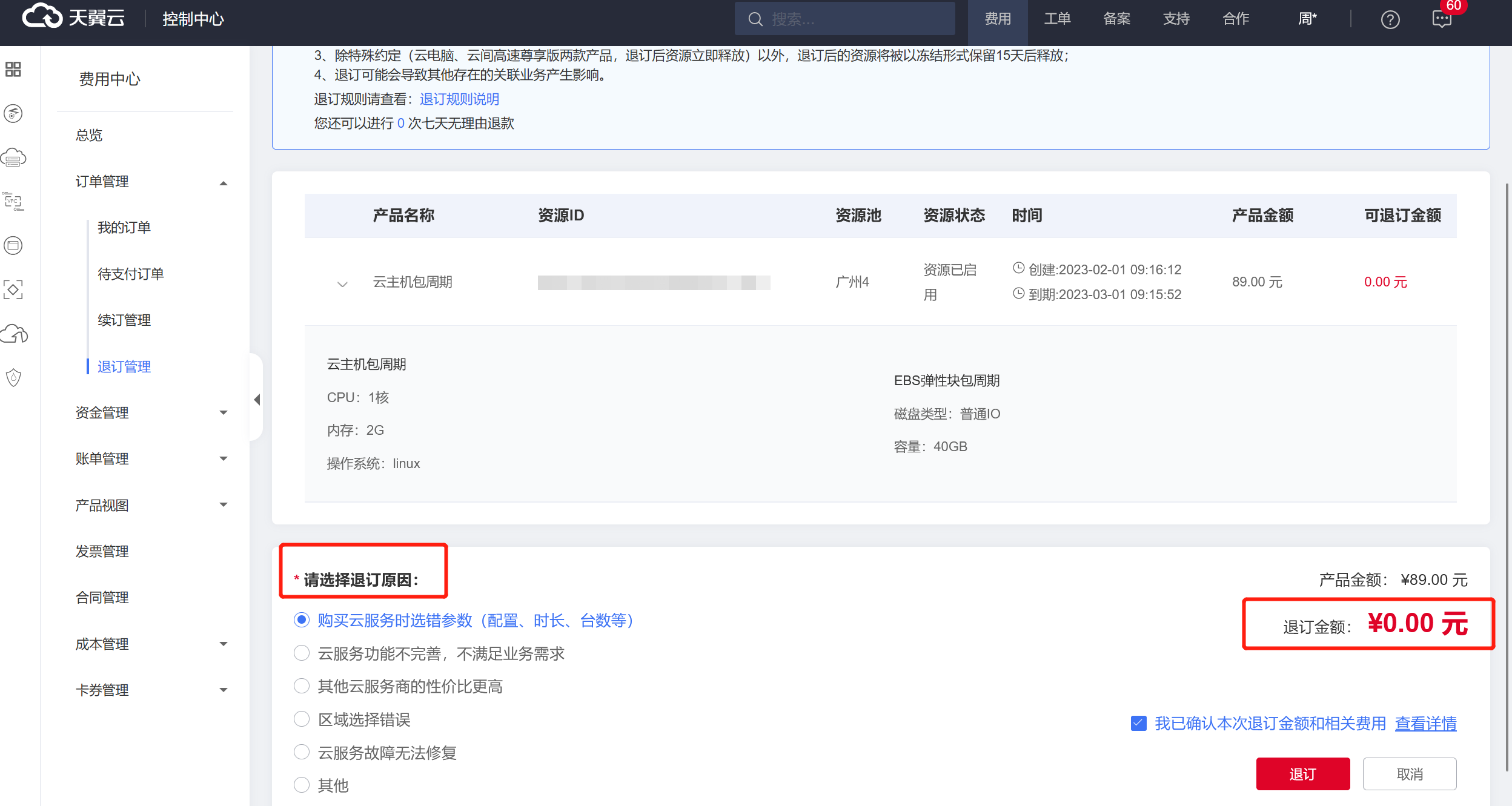 3、退訂前仔細閱讀退訂須知,然后確認退訂資源信息,包括產品名稱、資源ID、規格、時間及可退訂金額。