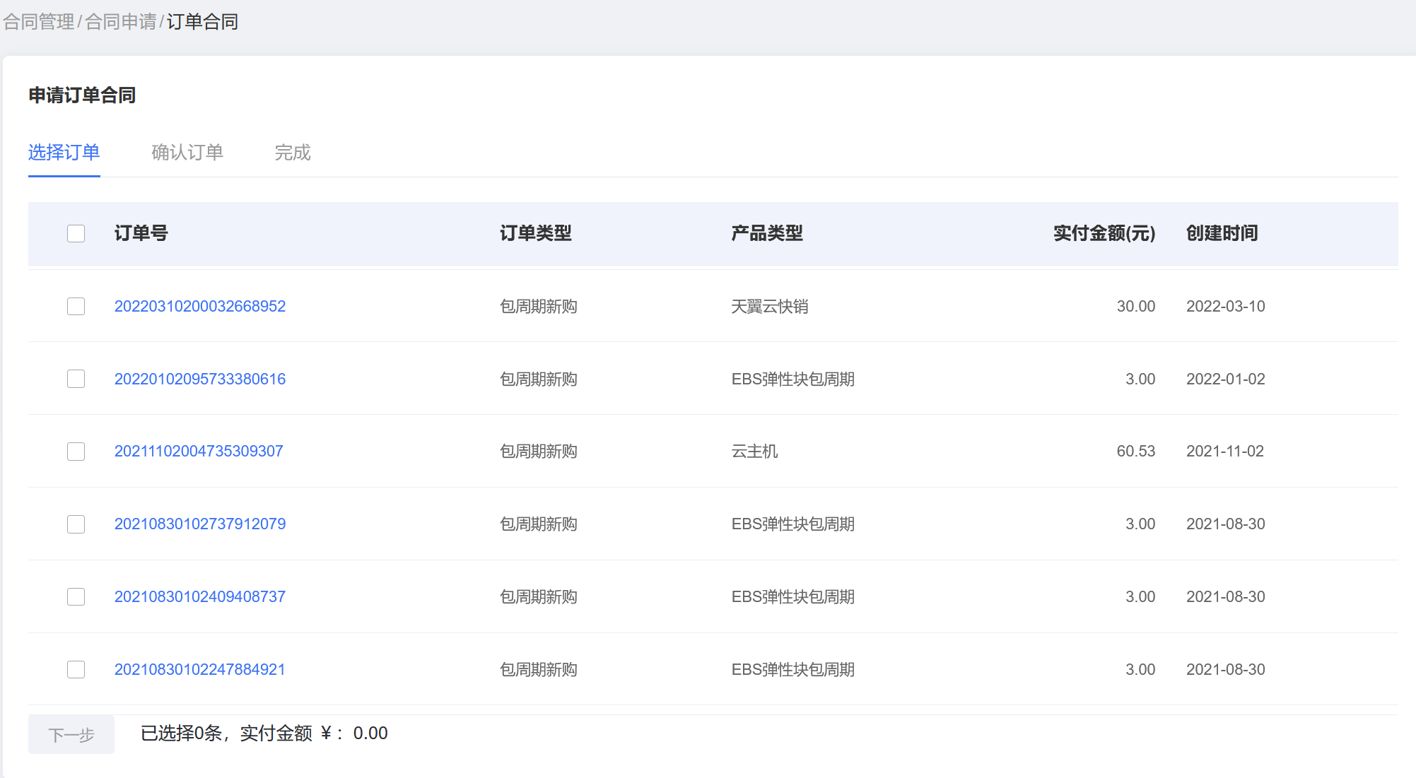 為已購的包年、包月資源申請線上合同。選擇需申請線上合同的訂單后,單擊“下一步”。現支持選擇多筆訂單生成一份合同。