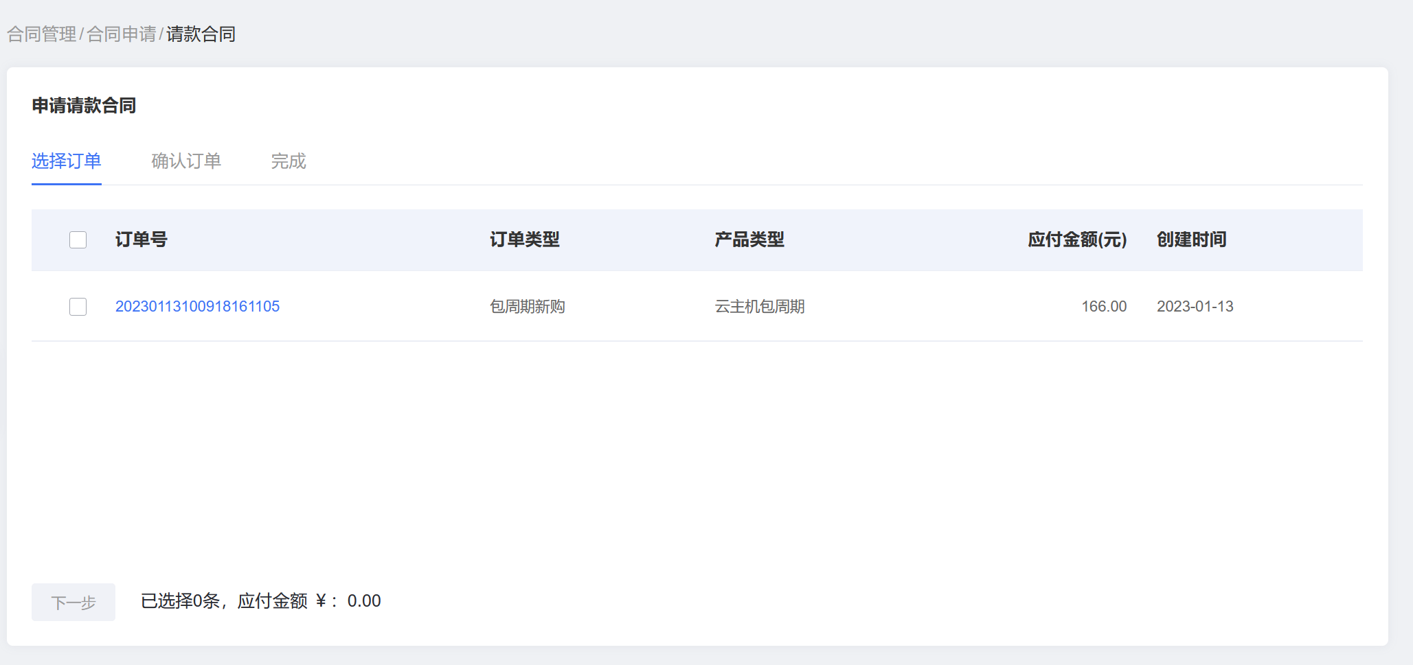 選擇待支付的包年、包月資源申請請款合同。選擇需申請請款合同的訂單后,單擊“下一步”。現支持選擇多筆訂單生成一份合同。