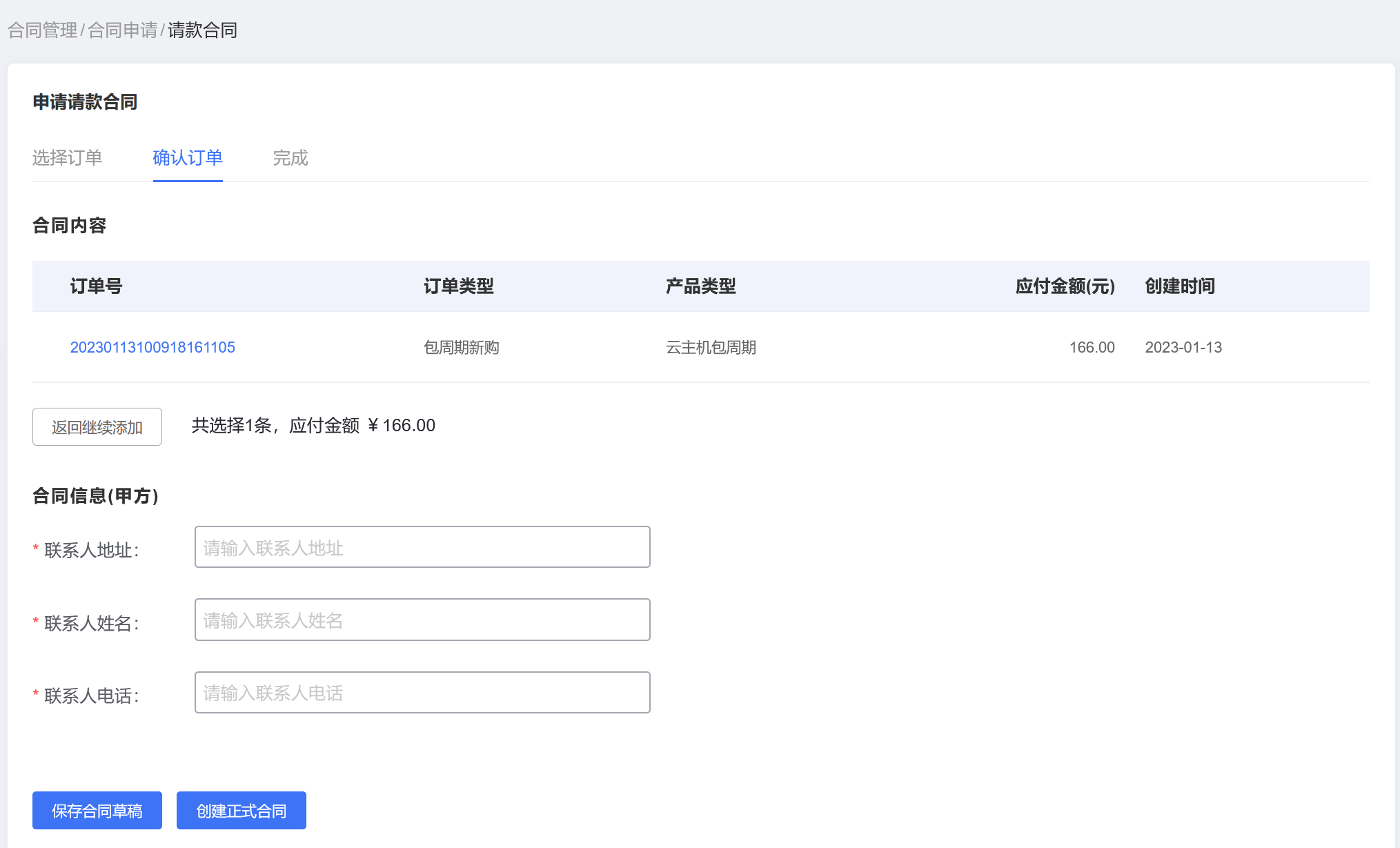 確認要申請合同的訂單,并添加您的合同信息。此信息即作為聯系人地址、聯系人姓名、聯系人電話。甲方抬頭系統默認為您的實名認證名稱。