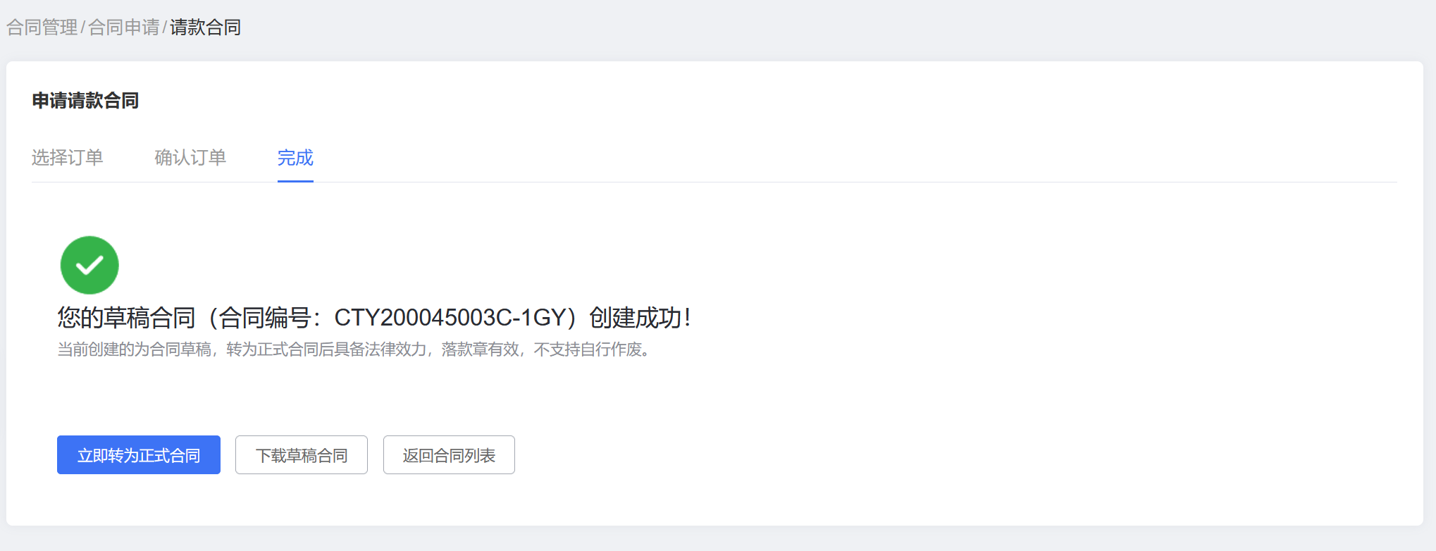 已完成:草稿合同轉為正式合同后,系統自動加蓋電子簽章,狀態為“已完成”。正式合同具有法律效力。
