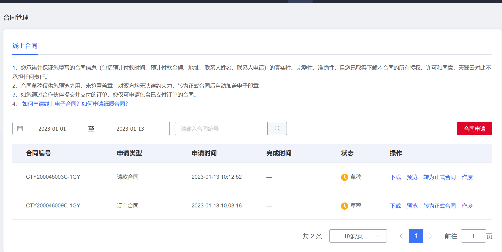 登錄官網,在首頁點擊“管理中心-費用-發票與合同”,選擇進入“合同管理”頁面,可執行以下操作申請訂單合同: