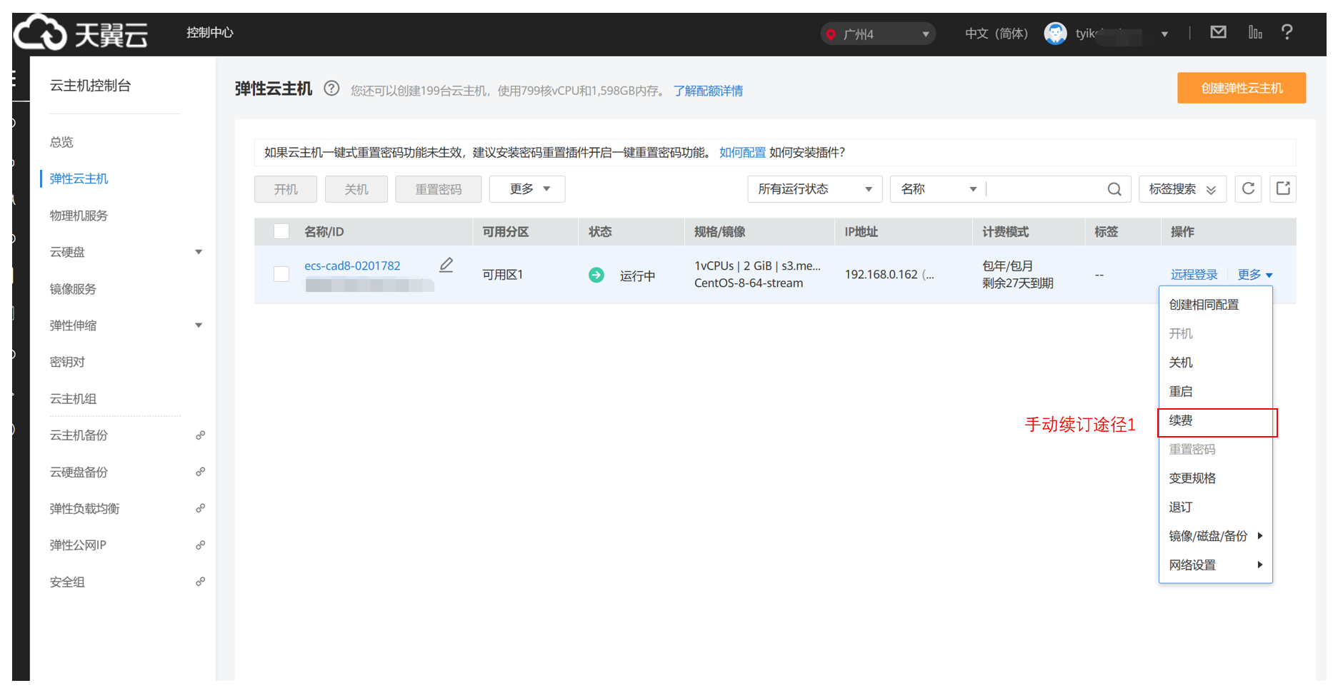 1、控制臺資源管理界面找到所需續訂的資源,點擊“操作”下面的更多,點擊“續費”,將跳轉續訂頁面。
