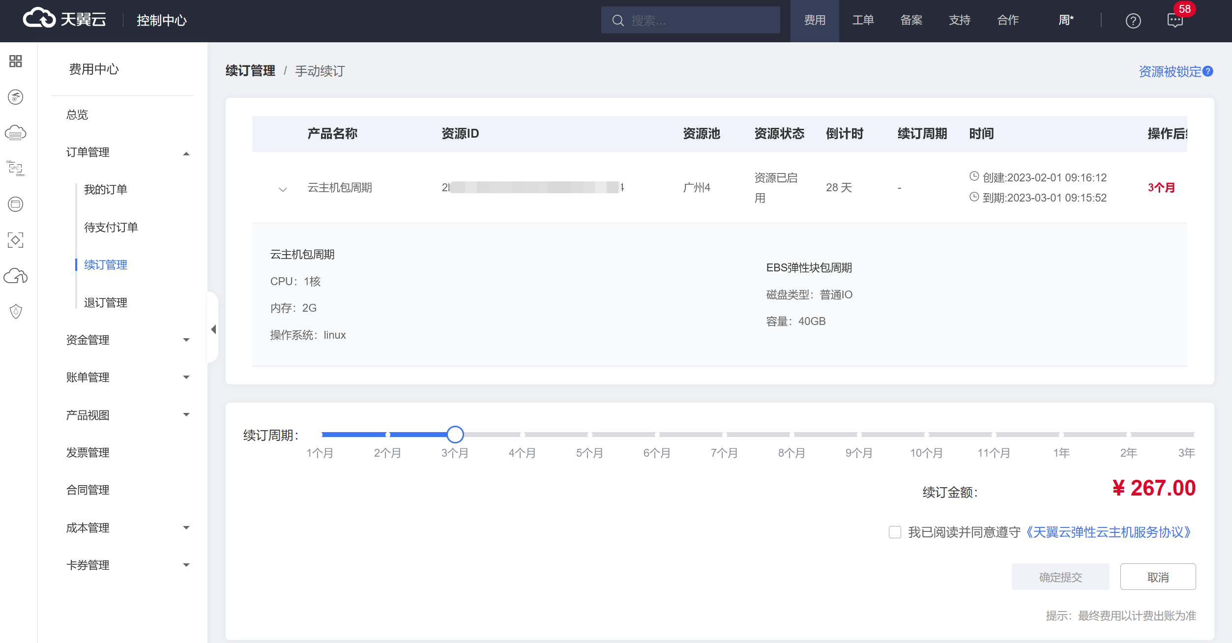 2、在續訂頁面,可點擊左側下拉鍵查看資源ID、配置等資源信息,確認后調整續訂周期,勾選協議后提交訂單并完成支付。