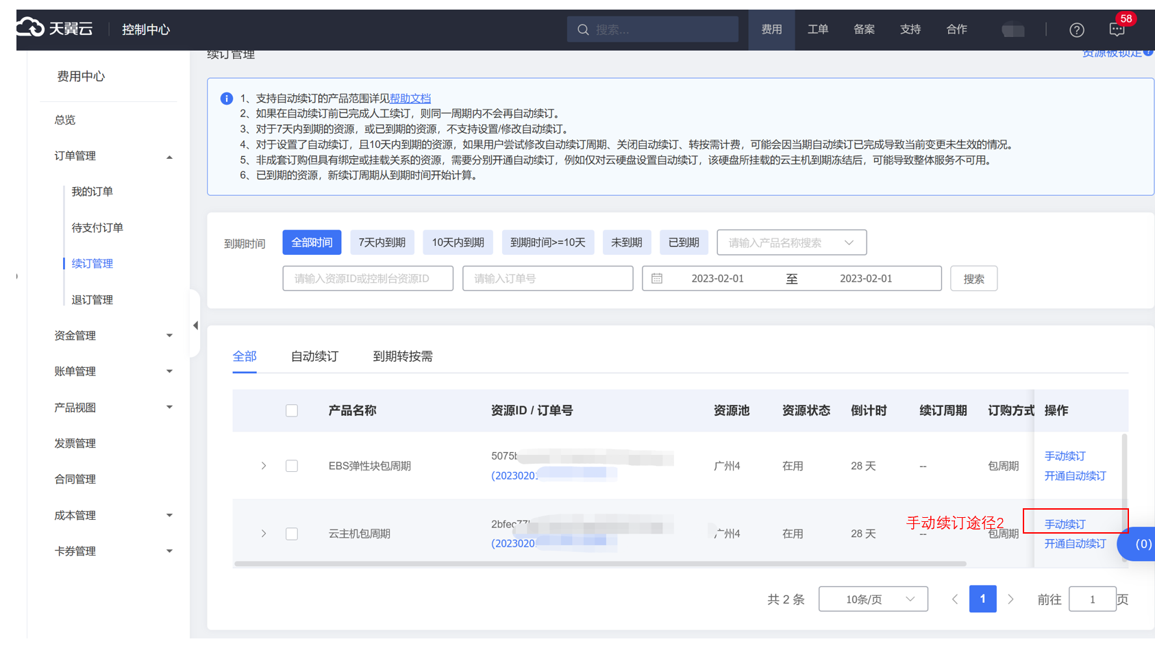 1、進入費用中心-訂單管理-續訂管理頁面,通過資源到期時間、產品名稱等篩選或搜索,找到并勾選所需續訂的資源,點擊“手動續訂”。