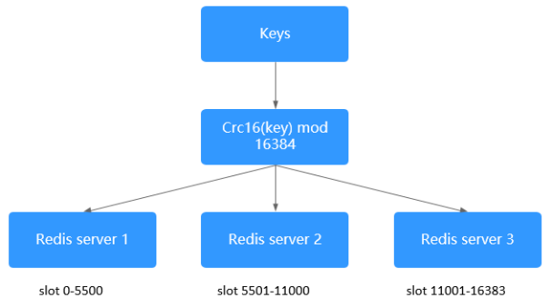 Redis Cluster會預先分配(pei)16384個(ge)slot,每個(ge)Redis的server存(cun)儲所有slot與redis server的映射關系。key存(cun)儲在哪個(ge)slot中,由Crc16(key) mod 16384的值(zhi)決定。如(ru)下圖所示: