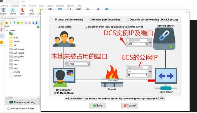 因此,我們可以采用(yong)ssh工具的隧(sui)道代理機制,通過一(yi)臺(tai)既能連接DCS緩存(cun)實例,又(you)能被本地電腦訪問的中轉服務器,實現“代理轉發”。