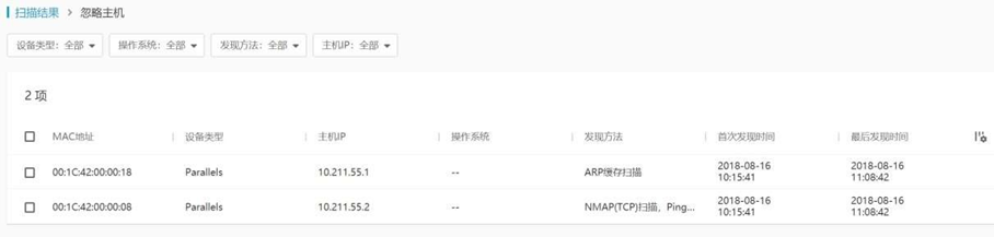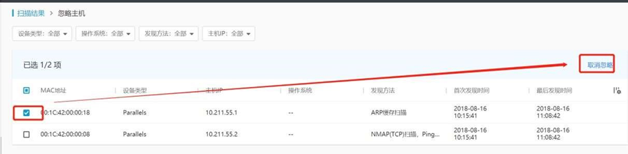 加入到忽略主機列表后的主機將不再出現在發現主機列表中,已忽略的主機,可以在忽略主機列表界面取消忽略。