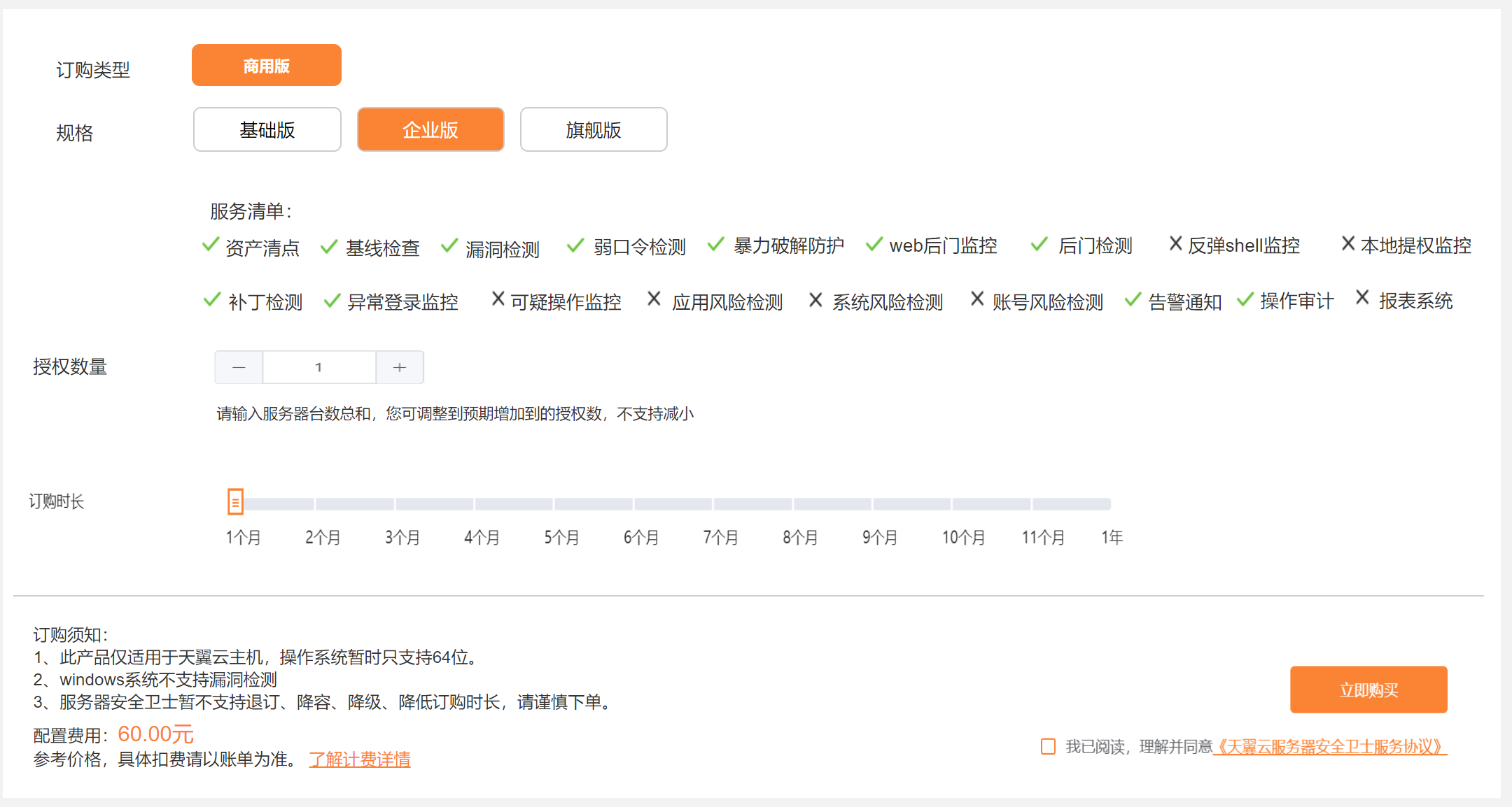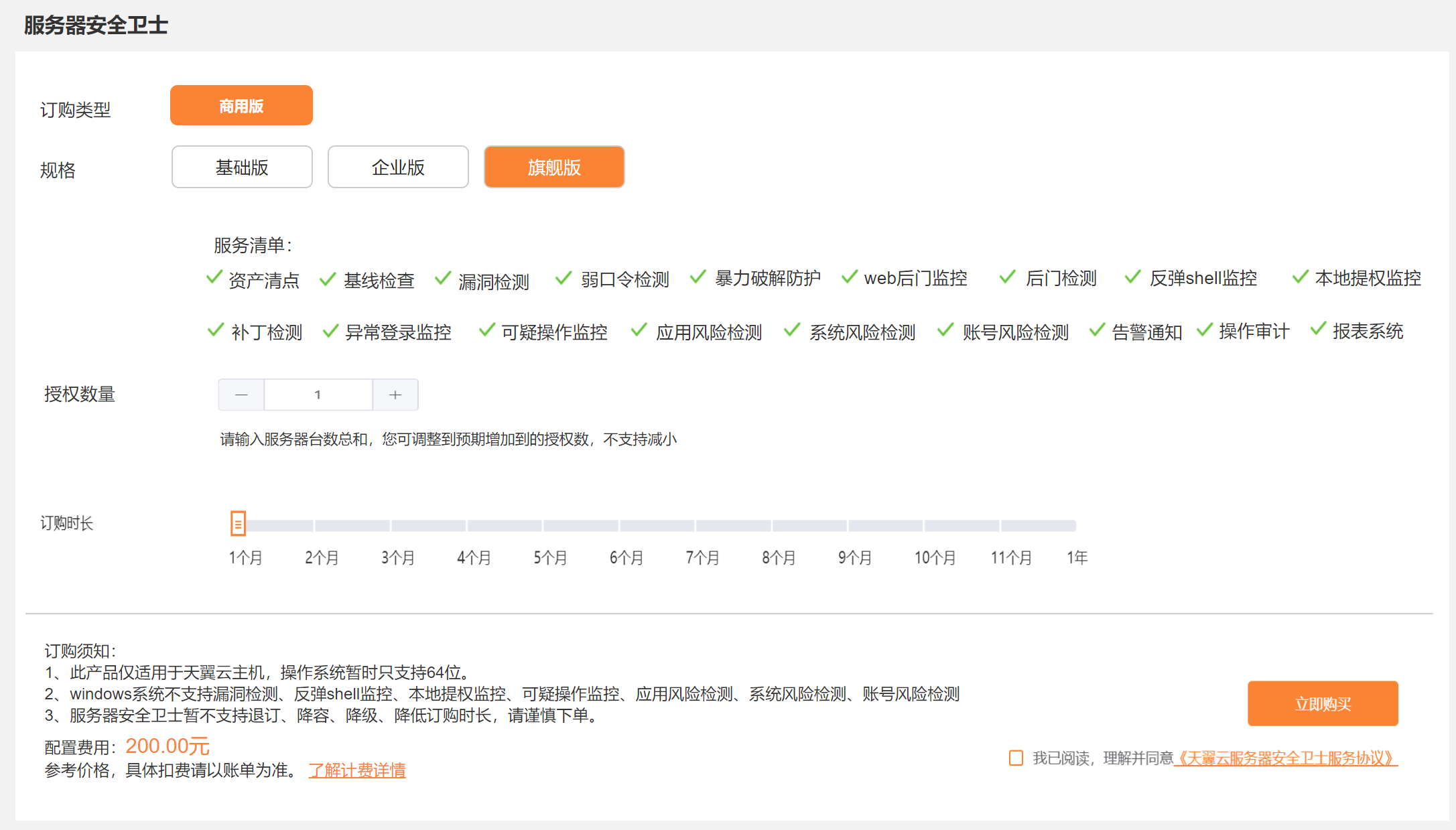 2.選擇規格、授權數量和訂購時長,提交訂單,購買成功后即可進入控制中心-“服務器安全衛士”界面進行后續操作。