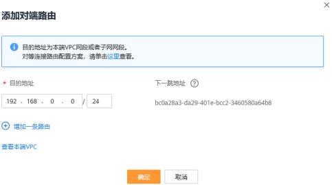 在已創建的對等路由“鄭州-對等連接-VPN測試用1”控制臺中,在“對端路由”中點擊“添加對端路由”。