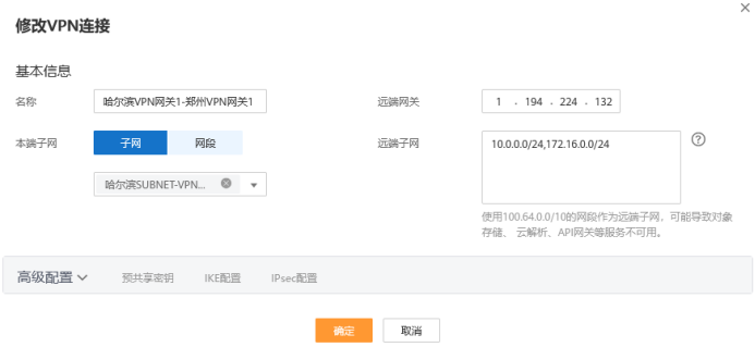 在兩方已經創建的VPN連接配置中,需要將鄭州節點的另一VPC中子網“鄭州SUBNET-VPN測試用2”,即子網10.0.0.0/24網段添加在VPN連接中。