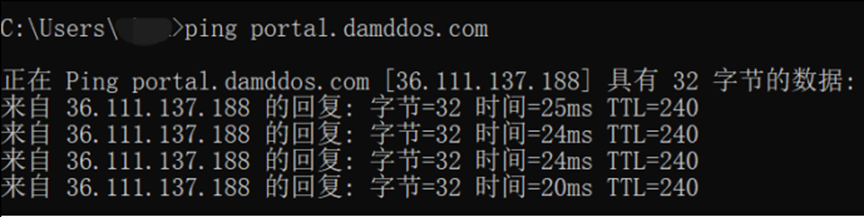 ping portal.damddos.com.iname.damddos.com獲取WAF的回源IP。如下圖所示,在響應結果中可以看到用來防護您的域名的WAF回源IP。 -
