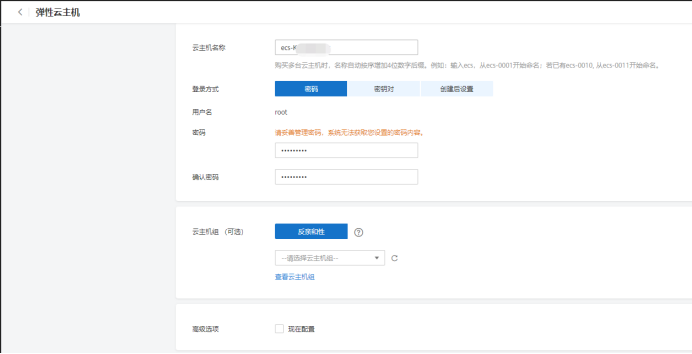4.配置網絡信息后,單擊“下一步:高級配置”。ECS與待連接的集群實例的VPC和安全組一致。