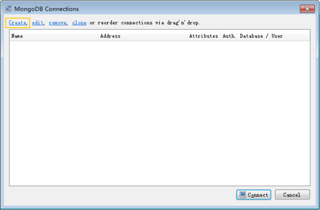 步驟 1打(da)開Robo 3T工具,在連接(jie)信息頁面,單擊(ji)“Create”。