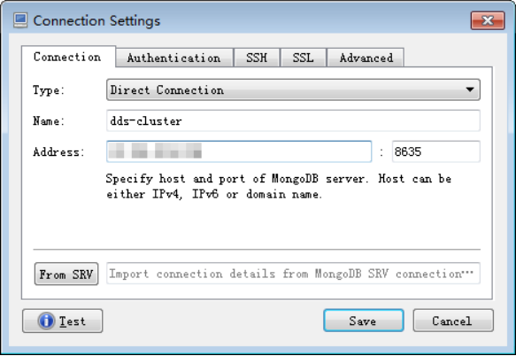 3.在“Connection”頁簽,“Name”填寫自定(ding)義的(de)新建(jian)連接(jie)的(de)名(ming)稱,“Address”填寫集(ji)群(qun)實(shi)(shi)例(li)綁定(ding)的(de)彈性IP和(he)實(shi)(shi)例(li)的(de)數據庫端口。