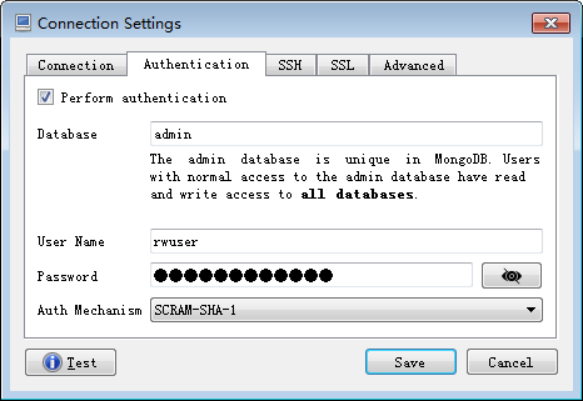 4.在“Authentication”頁簽,“Database”填寫(xie)(xie)admin,“User Name”填寫(xie)(xie)rwuser,“Password”填寫(xie)(xie)您創建集群實例時設(she)置的管(guan)理員密碼。