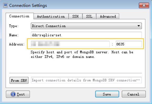 在“Connection”頁簽,“Name”填寫自定義的(de)新建連接的(de)名稱,“Address”填寫副(fu)本(ben)集實例綁定的(de)彈性(xing)IP和實例的(de)數據庫端口。