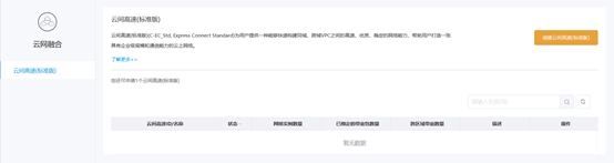 創建云間高速(尊享版): 1、登錄天翼云控制中心; 2、單擊 3、進入云間高速服務界面,點擊【創建云間高速】,如圖所示: 創建云間高速(標準版): 1、登錄天翼云控制中心; 2、單擊 3、進入云間高速服務界面,點擊【創建云間高速(標準版)】,如圖所示: