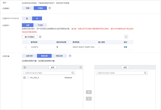 當您選擇遷移用戶時,請參見《數據庫復制服務用戶指南》中“遷移用戶”章節進行數據庫用戶、權限及密碼的處理。