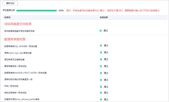 查看檢查結果,如有不通過的檢查項,需要修復不通過項后,單擊“重新校驗”按鈕重新進行遷移任務預校驗。