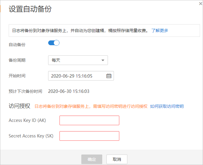 注意執行備份后,審計日志將備份到對象存儲服務上,系統自動為您創建桶,桶將按用量收費。