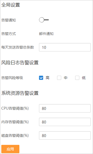 | 告警風險等級 | 選擇產生告警通知的風險日志告警風險等級,可以選擇:高中 低 | 高 |