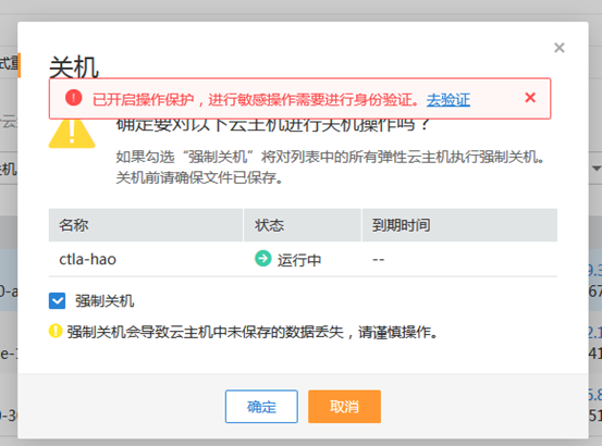 適用于北京/內蒙1、2/上海1、2、3/廣州1、2、3/廈門1、2/成都2/西安/長沙/南京/福州2/沈陽/武漢節點 1、云主機做關機操作。 2、彈出關機提醒界面,并帶有驗證提醒欄。如下圖, 3、點擊【發送驗證碼】,將獲取到的驗證碼填入輸入框,繼續進行關機操作。驗證碼未填寫或填寫錯誤點擊【確認】后均顯示“驗證碼不正確”,無法執行關機操作。 適用于貴州/福州/杭州/深圳/廣州4/蘇州/鄭州/青島/西安2/上海4/蕪湖/南寧/長沙2/南昌/成都3/烏魯木齊/昆明/海口/重慶/武漢2/蘭州/西寧/太原/石家莊/中衛/長春/天津/北京2/哈爾濱節點 1、云主機做關機操作。 2、彈出關機提醒界面,并帶有驗證提醒欄。如下圖, 3、點擊去驗證,跳轉操作保護頁面。如下圖, 4、點擊【免費獲取驗證碼】,驗證碼會發送到天翼云賬號預留手機號,填寫正確的驗證碼,點擊【認證】,彈出認證成功(失敗)提示框。 5、認證成功自動跳轉回云主機關機彈窗界面,繼續進行關機操作。