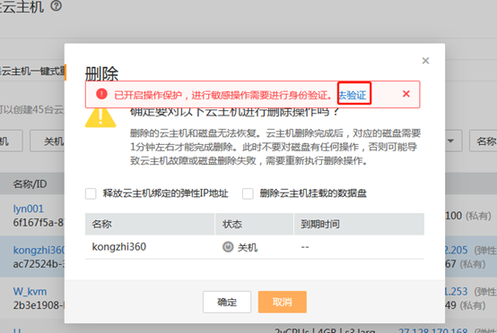 適用于貴州/福州/杭州/深圳/廣州4/蘇州/鄭州/青島/西安2/上海4/蕪湖/南寧/長沙2/南昌/成都3/烏魯木齊/昆明/海口/重慶/武漢2/蘭州/西寧/太原/石家莊/中衛/長春/天津/北京2/哈爾濱節點 1、云主機做刪除操作。 2、彈出刪除提醒界面,并帶有驗證提示欄。如下圖, 3、點擊去驗證,跳轉操作保護頁面。如下圖, 4、點擊【免費獲取驗證碼】,驗證碼會發送到天翼云賬號預留手機號,填寫正確的驗證碼,點擊【認證】,彈出認證成功(失敗)提示框。 5、認證成功自動跳轉回云主機刪除彈窗界面,繼續進行刪除操作。