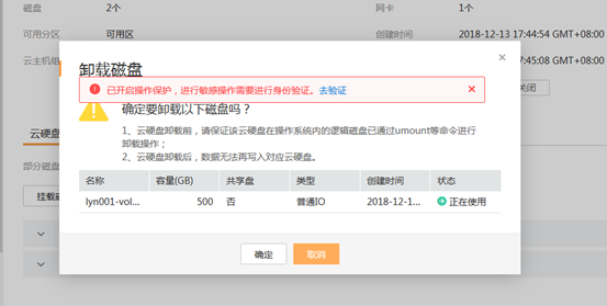 適用于貴州/福州/杭州/深圳/廣州4/蘇州/鄭州/青島/西安2/上海4/蕪湖/南寧/長沙2/南昌/成都3/烏魯木齊/昆明/海口/重慶/武漢2/蘭州/西寧/太原/石家莊/中衛/長春/天津/北京2/哈爾濱節點 1、云主機做卸載磁盤操作。 2、彈出磁盤卸載提醒界面,并帶有驗證提示欄如下圖, 3、點擊去驗證,跳轉操作保護頁面。如下圖, 4、點擊【免費獲取驗證碼】,驗證碼會發送到天翼云賬號預留手機號,填寫正確的驗證碼,點擊【認證】,彈出認證成功(失敗)提示框。 5、認證成功自動跳轉回磁盤卸載彈窗界面,繼續進行卸載操作。