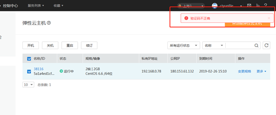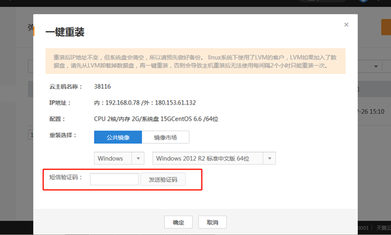 適用于北京/內蒙1、2/上海1、2、3/廣州1、2、3/廈門1、2/成都2/西安/長沙/南京/福州2/沈陽/武漢節點 1、云主機做重裝系統操作。 2、彈出一鍵重啟提醒界面,并帶有短信驗證框。如下圖, 3、點擊【發送驗證碼】,將獲取到的驗證碼填入輸入框,繼續進行重裝系統操作。驗證碼未填寫或填寫錯誤點擊【確認】后均顯示“驗證碼不正確”,無法執行重裝系統操作。