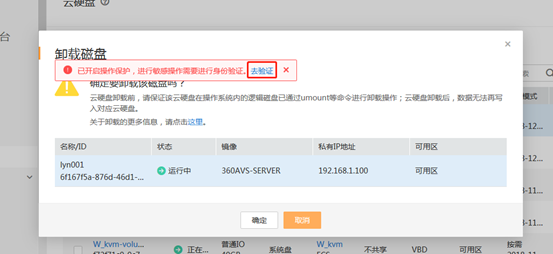 適用于貴州/福州/杭州/深圳/廣州4/蘇州/鄭州/青島/西安2/上海4/蕪湖/南寧/長沙2/南昌/成都3/烏魯木齊/昆明/海口/重慶/武漢2/蘭州/西寧/太原/石家莊/中衛/長春/天津/北京2/哈爾濱節點 1、對云硬盤進行卸載操作。 2、彈出云硬盤卸載提醒界面,并帶有驗證提示欄如下圖, 3、點擊去驗證,跳轉操作保護頁面。如下圖, 4、點擊【免費獲取驗證碼】,驗證碼會發送到天翼云賬號預留手機號,填寫正確的驗證碼,點擊【認證】,彈出認證成功(失敗)提示框。 5、認證成功自動跳轉回云硬盤卸載彈窗界面,繼續進行卸載操作。