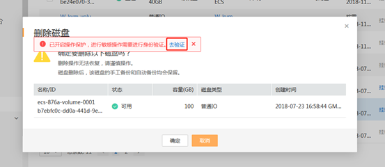 適用于貴州/福州/杭州/深圳/廣州4/蘇州/鄭州/青島/西安2/上海4/蕪湖/南寧/長沙2/南昌/成都3/烏魯木齊/昆明/海口/重慶/武漢2/蘭州/西寧/太原/石家莊/中衛/長春/天津/北京2/哈爾濱節點 云硬盤在卸載狀態才能做刪除操作,如果15分鐘內連續做卸載和刪除操作,則卸載時已做短信驗證,刪除無須驗證。否則操作如下, 1、對云硬盤進行刪除操作。 2、彈出云硬盤刪除提醒界面,并帶有驗證提示欄如下圖, 3、點擊去驗證,跳轉操作保護頁面。如下圖, 4、點擊【免費獲取驗證碼】,驗證碼會發送到天翼云賬號預留手機號,填寫正確的驗證碼,點擊【認證】,彈出認證成功(失敗)提示框。 5、認證成功自動跳轉回云硬盤刪除彈窗界面,繼續進行刪除操作。