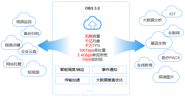 - 千億對象,千萬并發:OBS通過智能調度和響應,優化數據訪問路徑,并結合傳輸加速、大數據垂直優化等,為各場景下用戶的千億對象提供千萬級并發、超高帶寬、穩定低時延的數據訪問體驗。