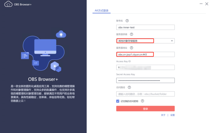 由于OBS Browser+默認使用公網訪問OBS,因此在登錄OBS Browser+添加帳號時,“服務提供商”和“服務器地址”需要按照以下要求填寫: