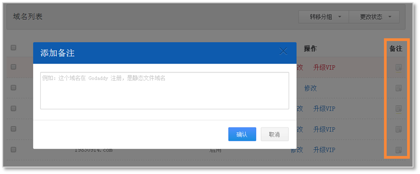 在域名維護頁面,最后一列是備注列,用戶可點選對應域名的備注圖標添加備注。