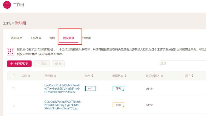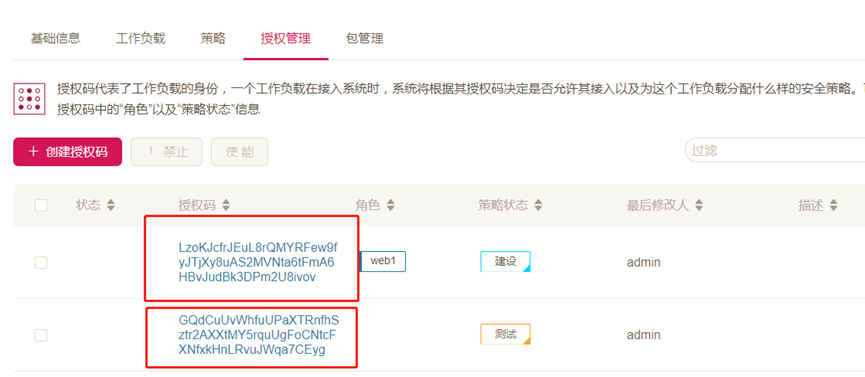 授權碼代表了工作負載的身份,一個工作負載在接入系統時,系統將根據其授權碼決定是否允許其接入、配置什么樣的安全策略、分配到哪個工作組等。