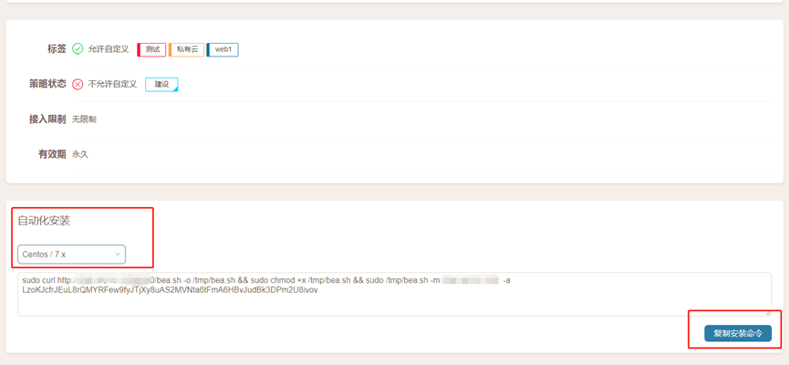 4.授權碼詳細頁面最下方的自動化安裝部分,可根據此授權碼自動生成安裝命令,用于實現工作負載的自動化安裝。