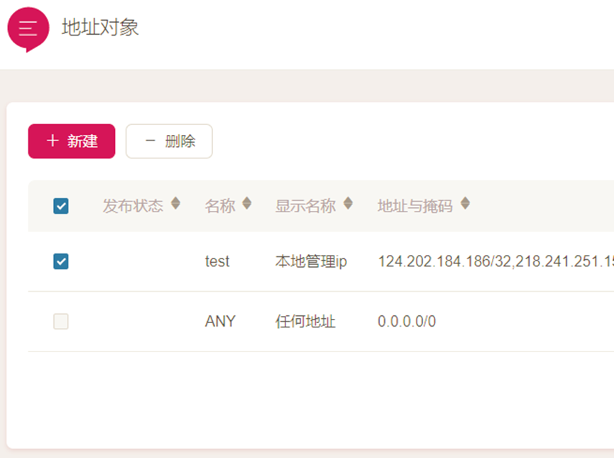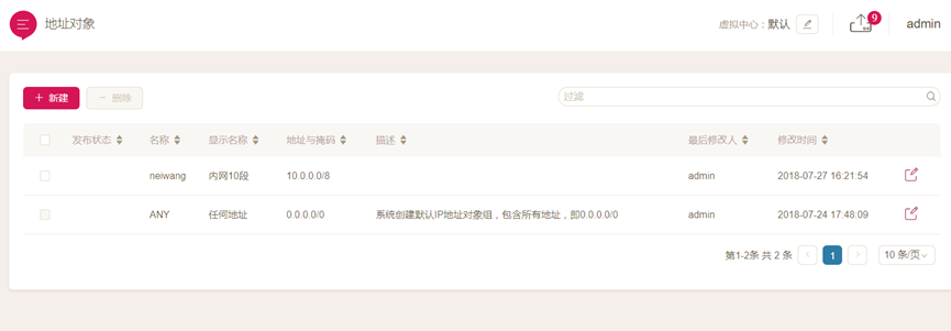 2.地址對象頁面可以對地址對象進行新建、刪除、修改操作。