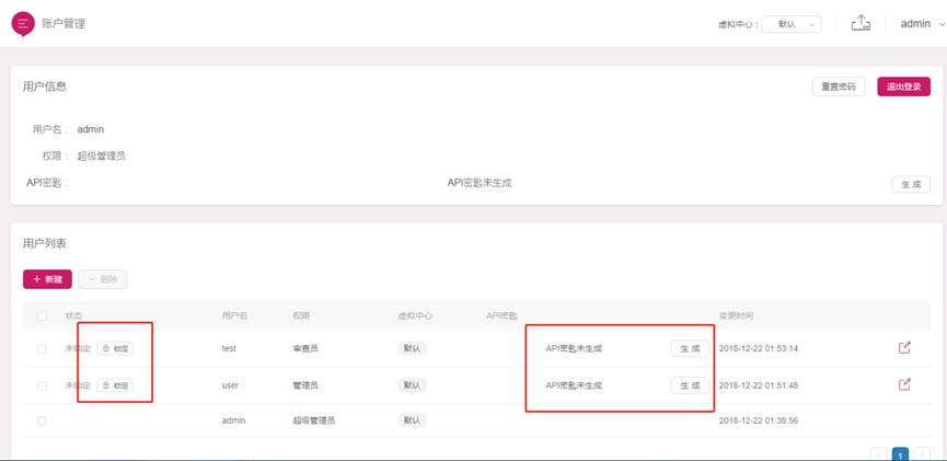 3.超級管理員可以在賬戶管理頁面解鎖被鎖定的用戶,也可針對某一用戶生成API密鑰。被生成API密鑰的賬戶,可以使用API接口。
