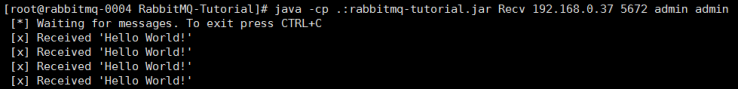 $ java -cp .:rabbitmq-tutorial.jar Recv host port user password