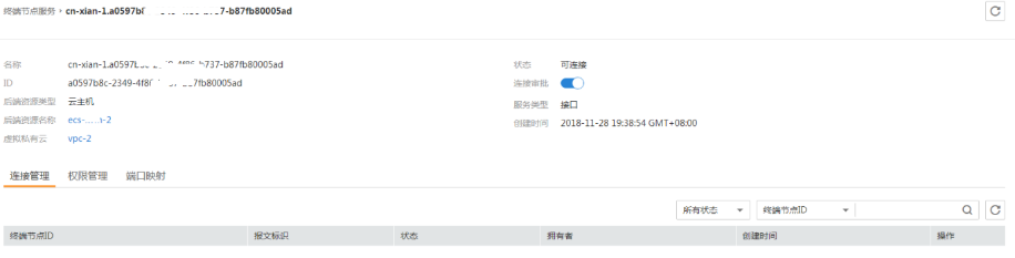 查看終端節點服務的后端服務名稱、服務類型、虛擬私有云、狀態等。