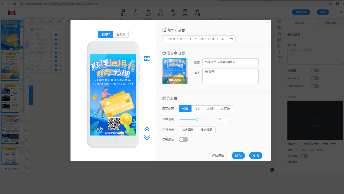 點擊頁面右上角“預覽/發布”,3.0活動會自動保存,同時彈出預覽框,可編輯活動時間、微信分享設置、翻頁設置等。點擊預覽頁右上角“二維碼按鈕”,可用手機掃碼查看預覽,預覽并檢查做的活動是否滿意,滿意后可點擊右下角的”發布按鈕”,發布后后臺會進行審核,審核通過后活動正式生效。