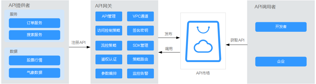 - 如果您作為API提供者,您可以將成熟的業務能力(如服務、數據等)作為后端服務,在API網關中開放API,并通過線下方式提供給API調用者使用,或者發布到API市場,實現業務能力變現。
