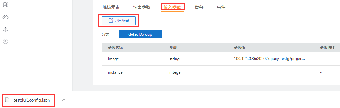顯示在堆棧模板中聲明的輸入參數及其取值。還支持導出配置,格式為.json文件。