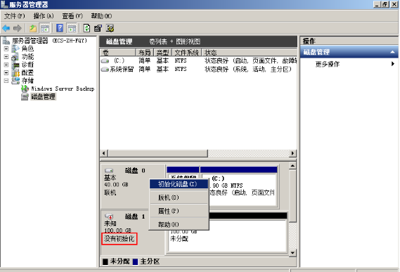 4.聯機后,磁盤1由“脫機”狀態變為“沒有初始化”,右鍵單擊在菜單列表中選擇“初始化磁盤”。如下圖所示。