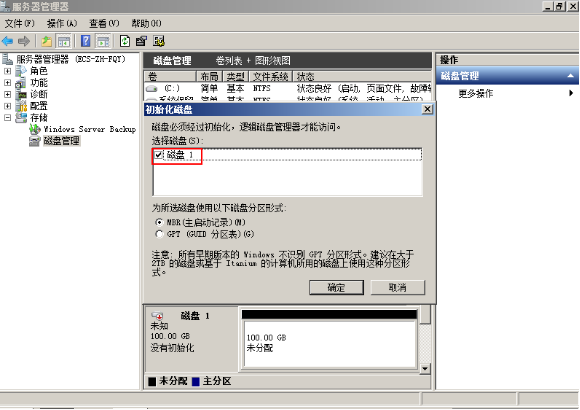 5.在“初始化磁盤”對話框中顯示需要初始化的磁盤,選中“MBR(主啟動記錄)”或者“GPT (GUID 分區表)”,單擊“確定”,如下圖所示。