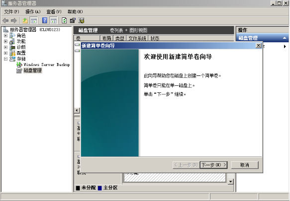7.彈出“新建簡單卷向導”對話框,根據界面提示,單擊“下一步”。